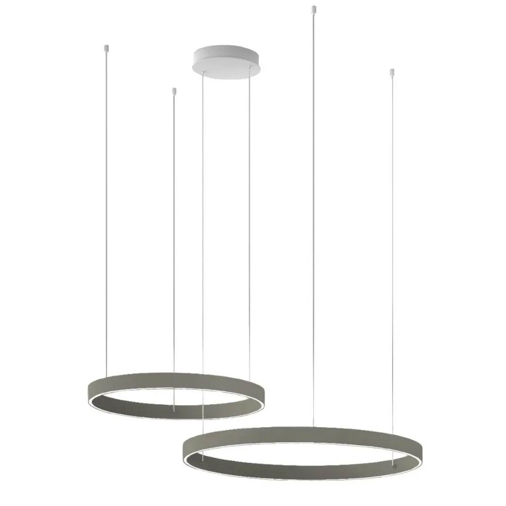 Die moderne Pendelleuchte GAME BIS S80+S100 besteht aus zwei eleganten, leuchtenden Kreisen mit 80 cm bzw. 100 cm Durchmesser, die einen dramatischen und zugleich raffinierten Effekt erzeugen. Getragen von einem stabilen Deckenfuß und ausgestattet mit drei Dimmern, bietet diese Leuchte dank weißer, opalfarbener Silikondiffusoren eine bidirektionale Beleuchtung, die das Licht sowohl nach oben als auch nach unten streut. Diese Anordnung sorgt nicht nur für eine gleichmäßige und flächige Ausleuchtung der darunterliegenden Fläche, sondern nutzt die Decke auch als natürlichen Reflektor, wodurch der Raum optisch erweitert und eine besonders ästhetische Atmosphäre geschaffen wird.