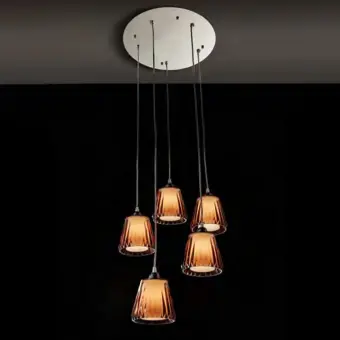 Moderne Multi-Light-Pendel mit kleinen kegelförmigen Lampenschirmen aus Acrylmaterial, die das Licht streuen und dem Raum einen Hauch von Farbe verleihen. Ein Kronleuchter, der entweder auf dem Tisch, auf dem Schreibtisch oder einer anderen Auflagefläche oder in der Mitte des Raumes und vielleicht in gestaffelten Höhen installiert werden kann.