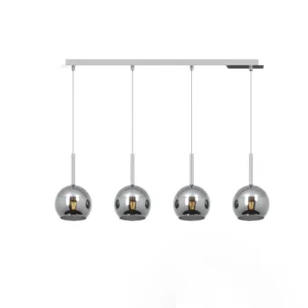 Hängelampen bestehend aus vier höhenverstellbaren Ampullen aus mundgeblasenem Pyrexglas. Struktur aus poliertem Chrommetall. Die vierflammige Pendelleuchte ist mit vier E27-Fassungen für LED-Leuchtmittel jeder Wattzahl ausgestattet. Leuchtmittel ausgeschlossen.