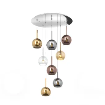 FUTURE 1155CR/S8 TP MC , mit runder Rosette aus verchromtem Metall und 8 Pyrex-Glaskolben mit einem Durchmesser von 15 cm (1X transparent + 1X Bernstein + 2X Chrom + 2X Gold + 2x Kupfer). Kabel in der Länge verstellbar. Eine Kollektion, die dank der zahlreichen verfügbaren Variationen eine große Auswahlmöglichkeit bietet. Ein modernes und äußerst vielseitiges Element mit einem hervorragenden Preis-Leistungs-Verhältnis, ideal für jeden Kontext, insbesondere für die Installation im Wohnzimmer oder in der Küche. Die untere Öffnung der Ampullen ermöglicht eine einfache Wartung und Reinigung. Dank der Lampenfassungen mit E27-Fassung ist es möglich, jede Art von LED-Lichtquelle einzusetzen, wobei die Leistung und Farbe des Lichts Ihren Bedürfnissen entspricht. Glühbirnen separat erhältlich.