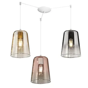 Dreiflammige Pendelleuchte mit schlichtem Design, aber mit einer hellen und farbenfrohen Wirkung im Raum. Ein Kronleuchter mit doppelter Helligkeit, der für Halbinseln, Esstische, Schreibtische ... oder zur Installation in der Mitte jedes Raumes empfohlen wird. Beleuchten und einrichten Sie mit Einfachheit.