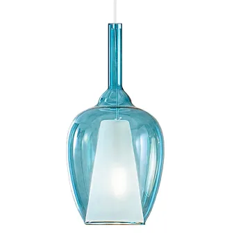 Hängeleuchte mit einzigartiger Form, aber gekennzeichnet durch ein Doppelglas mit glatter Verarbeitung und einer Transparenz, die nicht belastet und Farbe verleiht. Ein Tropfen, der sich an jeden Raum anpasst, auch in mehreren Versionen, oder auf Untergründen wie Halbinseln, Esstischen oder Schreibtischen.