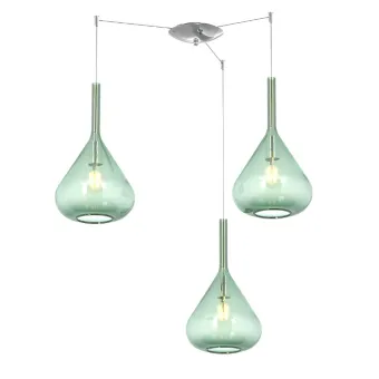 Diese Kombination aus Materialien und Oberflächen macht die Aufhängung elegant und modern. Poliertes Chrom sorgt für ein glänzendes, reflektierendes Aussehen, während klares grünes Glas für einen Hauch von Farbe und Transparenz sorgt. Die Lampenfassung vom Typ E27 ist weit verbreitet und weit verbreitet, sodass es leicht ist, kompatible LED-Lampen zum Austauschen zu finden. LED-Lampen sind für ihre Energieeinsparung und lange Lebensdauer bekannt und verleihen Ihrer Pendelleuchte einen zusätzlichen Effizienzvorteil. Zusammenfassend bietet die KONA 1177- Federung eine Mischung aus Stil und Funktionalität. Mit ihren gut platzierten Lichtern und der Möglichkeit, LED-Leuchtmittel zu verwenden, ist diese Pendelleuchte ideal, um jeder Umgebung einen modernen und nachhaltigen Touch zu verleihen.