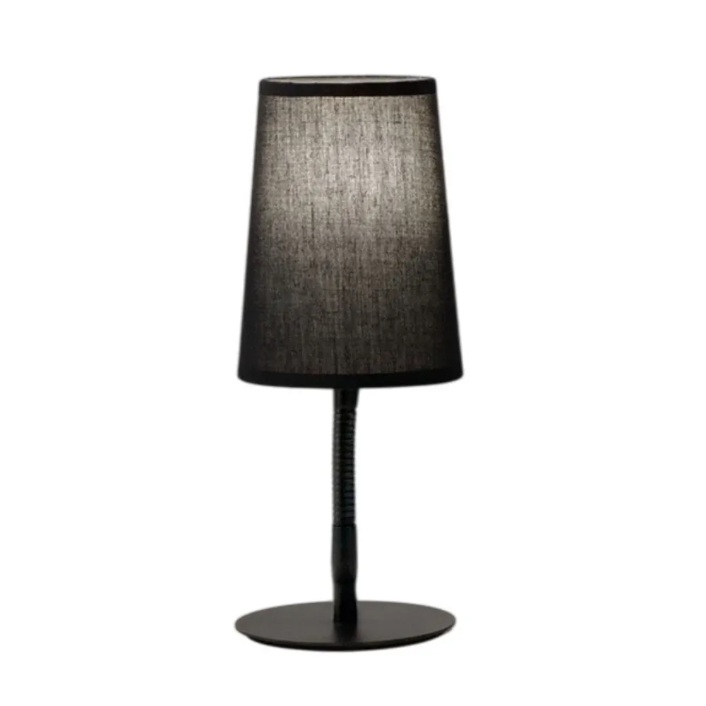 Flexible und verstellbare Metallkonstruktion, pulverbeschichtet in Mattschwarz, mit schwarzem Stofflampenschirm.
