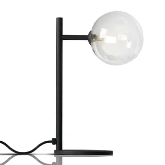 Lampenschirm mit wesentlicher Form und effizienter Lichtleistung. Eine Tischlampe mit diffusem Licht und transparentem Kugelglas, ideal als Nachttischbeleuchtung oder für andere kleine Platzierungen.