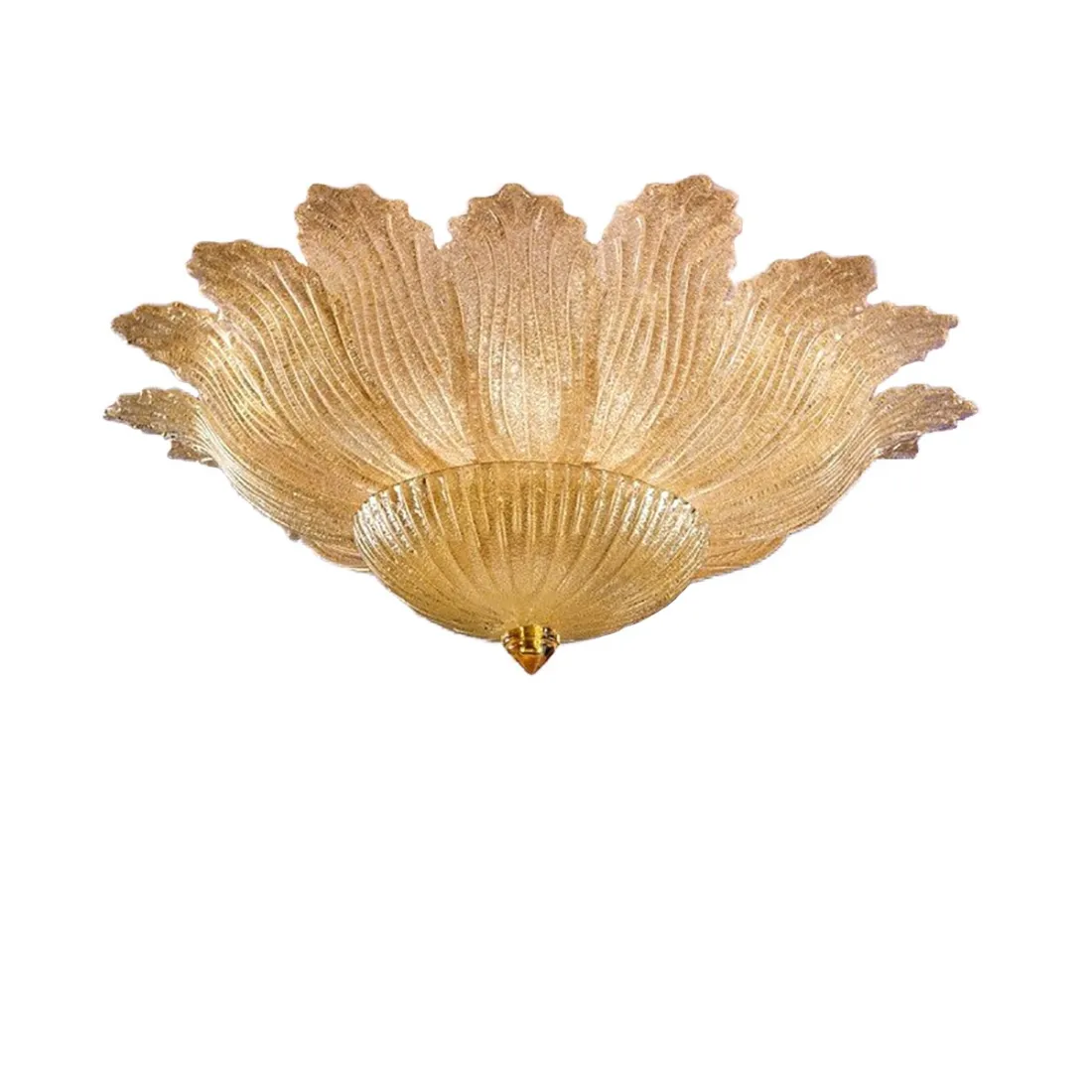 Struktur aus vergoldetem Metall und Glas in Form eines Blattes mit Körnung auf der Innenseite und glatt auf der Außenseite. Erhältlich mit kristall- (weiß) oder bernsteinfarbenen Blättern, hergestellt von unseren Muranoglasmeistern.