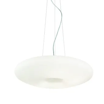 Extrem schlichter Kronleuchter, ein klassisches rundes Glas, das sich durch seine zentrale Aussparung auszeichnet. Ein weißes mundgeblasenes Glas mit diffusem Licht, um seine Höhe an Ihre Bedürfnisse anzupassen.