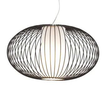 Aufhängung mit ovaler Form, neu und einfach aus lackiertem Stahl. Ein einflammiger Kronleuchter mit einem zylindrischen Stoffdiffusor, der das Licht gleichmäßig im Raum verteilt, ohne dass die Glühbirnen das Auge stören.