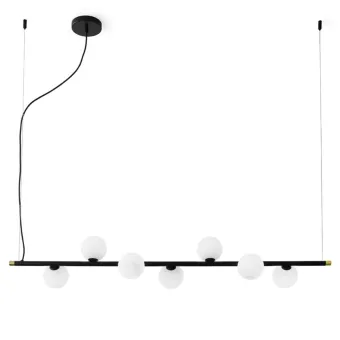 Der Lampenrahmen mit seinem schwarz lackierten Rahmen und den Details aus gebürstetem Messing verleiht dem Design einen Hauch von Klasse und Raffinesse. Die sieben Glaskugeln sind unterschiedlich ausgerichtet entlang eines horizontalen schwarzen Stabes angeordnet und erzeugen so eine dynamische und zeitgemäße visuelle Wirkung.