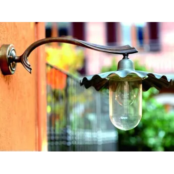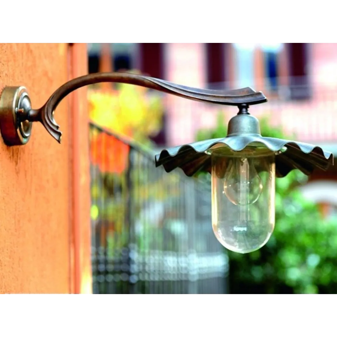 Außenwandleuchte aus unserer Produktion aus gealtertem Messing und original gewellter Aluminiumplatte, die an die alten Tage der Großmutter erinnert. Für diejenigen, die es lieben, Umgebungen mit Objekten zu beleuchten, die in ihrer Verarbeitung einzigartig sind und sie mit der handwerklichen Note verschönern. Hergestellt in Italien