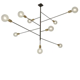 Aufhängung aus Metallrohren mit Epoxidpulver bemalt, Messing gebürstet, goldbraun, goldenes Elfenbein und von Hand verziert. Die Details sind aus gebürstetem Messing. Der Kronleuchter trägt neun E27-Lampenfassungen für Halogen- oder LED-Lampen. Leuchtmittel nicht enthalten.
