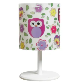 Zylinderförmiger Lampenschirm mit einer Fantasie von Tieren und Blumen, alle farbig für Kinderzimmer. Eine zylindrische Tischlampe, einfach in der Form und schön in der Dekoration ... eine Explosion aus vielen kleinen Blumen und bunten Tieren, die jubeln und erleuchten. Ein Produkt Made in Italy.
