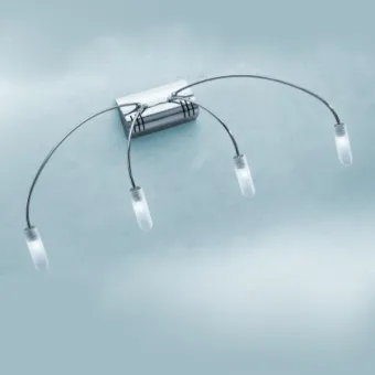 Struktur aus poliertem Chrom. Satinweiße Pyrex-Pantoletten mit Nagelschliff (auf Anfrage auch transparent). Passend für vier Lampenfassungen mit G4-Fassung für Halogen-Doppelsteckerlampen. Transformator im Lieferumfang enthalten. Lampen nicht im Lieferumfang enthalten.