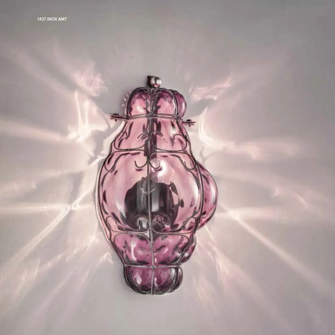 Lámpara de pared clásica c con un espectacular procesamiento del vidrio que toma forma a partir de la flexión del hierro. Una antigua artesanía revalorizada en nuestros días... el vidrio que se sopla y modela dentro de su estructura. Un salto a través de los siglos donde las formas evocan antiguas linternas y posadas en la época del esplendor veneciano. Hecho en Italia