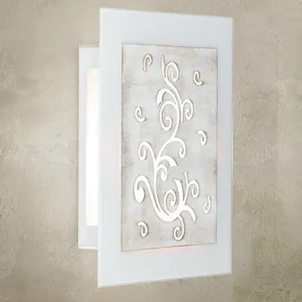 Aplique de pared particular y romántico en la decoración hecha con láser, un nuevo clásico pero no demasiado línea para colocar tanto en la pared como en el techo. Un aplique adornado con delicadas pinceladas hechas a mano que realzan esta luminaria como si de un cuadro se tratase. Un producto Made in Italy
