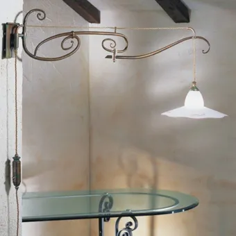 Práctico y funcional brazo de pared. Un aplique de pared de la colección COUNTRY, inspirado en conceptos clásicos derivados de las tendencias establecidas en la primera mitad de siglo, se integra con unas líneas de diseño muy particulares. La colección adquiere un aspecto particularmente agradable gracias también a la línea de vidrio. Hecho en Italia