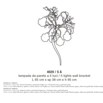 Aplique floral clásico y elegante. Un aplique con un acabado sobrio, rematado con precioso cristal de Murano y espléndidas gotas de cristal ámbar que reflejan la luz y el deslumbramiento en la estancia. Decora la pared con elegancia y gusto arquitectónico. Un producto Made in Italy