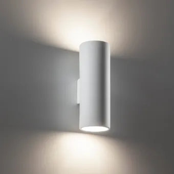 Aplique de pared en yeso blanco o para pintar y personalizar en color. Una lámpara con simpáticos rayos de luz arriba y abajo que salen del cilindro y crean un ambiente agradable y placentero en la estancia. Un haz de luz más homogéneo en la pared.