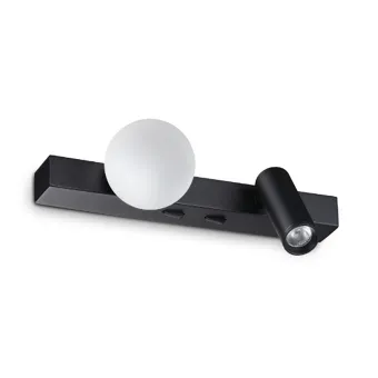 BINOMIO AP 336664 está equipado con dos puntos de luz, uno con esfera acrílica que difunde la luz y otro con un foco cilíndrico que proyecta la luz en un punto muy concreto, con interruptores independientes.