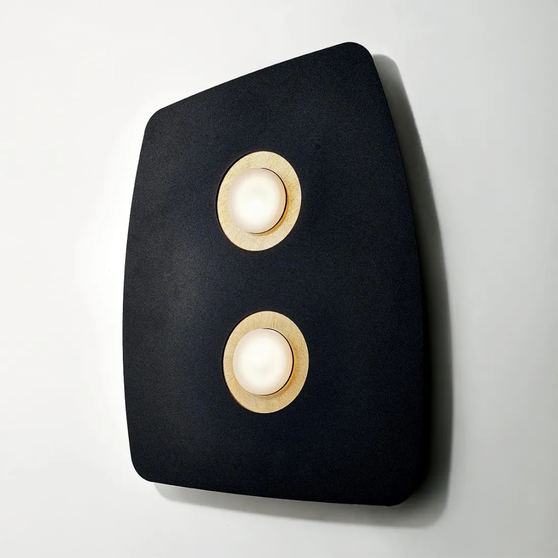 Estructura de metal NEGRO , aros centrales en pan de ORO . Bajo pedido, el aro central es intercambiable en colores blanco, negro o arena o decorado con pan de plata o cobre. La lámpara de pared o techo está equipada con dos casquillos GX53 para una bombilla LED no incluida.