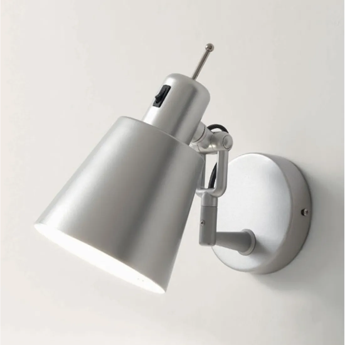 Fabricada con pantalla en color blanco, naranja o gris con interior de aluminio microperforado, exterior en color. Estructura de aluminio. Práctico encendido con interruptor colocado en la cabeza y pequeña antena para dirigir la luz.