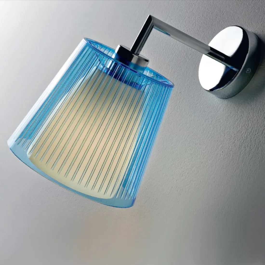 La lámpara de pared está equipada con una base de metal cromado con una pantalla acrílica disponible en transparente, topo, violeta, azul claro, rojo, naranja o rosa, recordando un estilo moderno.