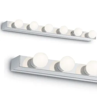 Aplique de pared de luz difusa, extremadamente simple pero de alto rendimiento lumínico. Un aplique típico de los cines, colocado sobre los espejos de peluquería y maquillaje para una iluminación explosiva.