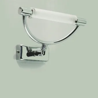 Estructura de metal cromado pulido (latón envejecido bajo pedido). Base rectangular, articulación regulable en todas sus partes y pirex satinado.