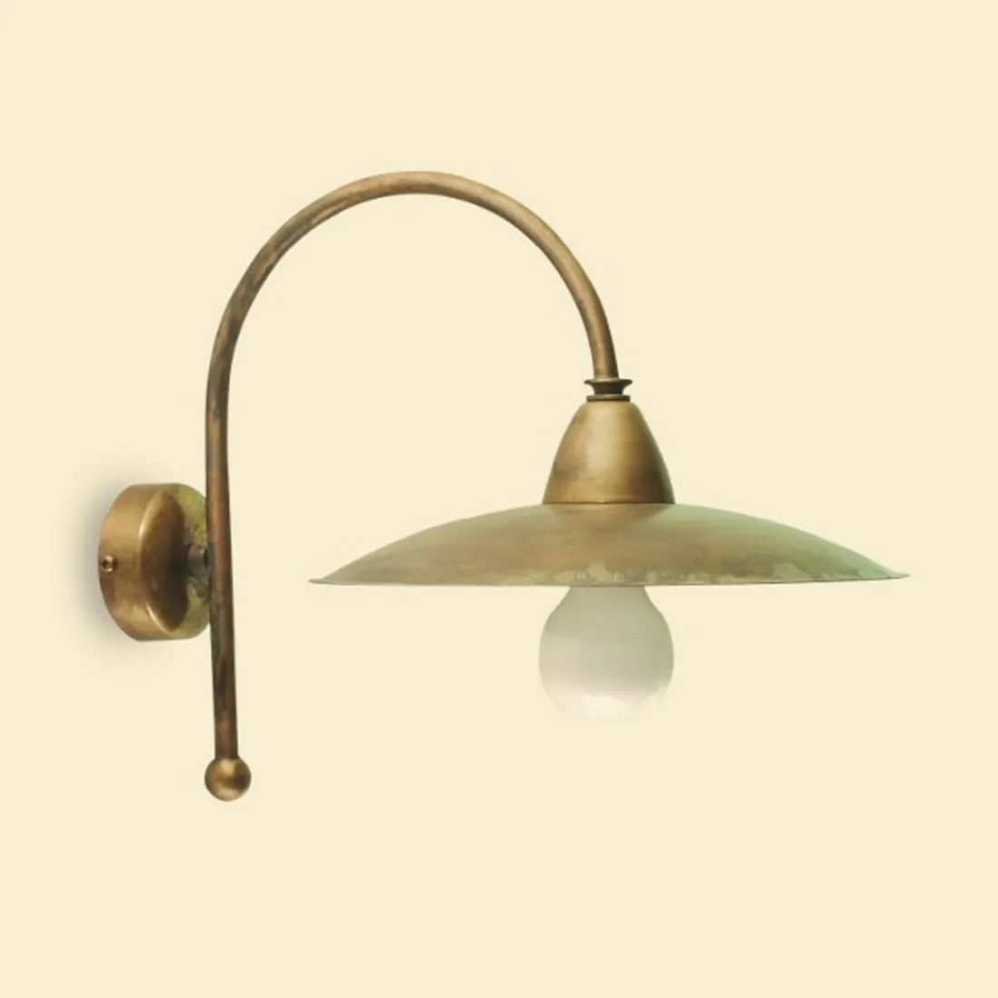 Lámpara de pared de nuestra producción realizada con el prestigioso latón y envejecido a mano. Un simple brazo arqueado que ilumina hacia abajo y difunde una amplia gama de luz. Apto para cualquier ambiente rústico o clásico. Hecho en Italia