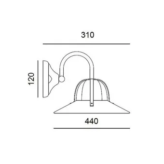 El aplique mide una base de anclaje a pared de 12cm de diámetro, una placa de 25cm de diámetro y un saliente de 31cm.
