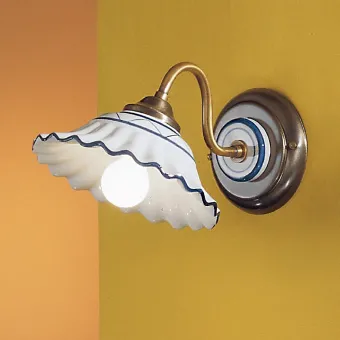Aplique de pared clásico con un brazo sinuoso rematado con un platillo de cerámica decorado. Un aplique ideal para muebles de estilo clásico o rústico para una iluminación exclusivamente hacia abajo.