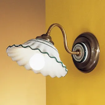 Aplique de pared clásico con un brazo sinuoso rematado con un platillo de cerámica decorado. Un aplique ideal para muebles de estilo clásico o rústico para una iluminación exclusivamente hacia abajo.