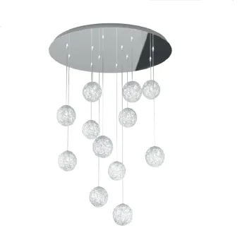 WILLOW está compuesto por una estructura de metal cromado pulido y esferas decorativas. Los difusores están compuestos por dos esferas de vidrio decorativas y concéntricas, la versión de la imagen representativa está realizada en alambre de aluminio en forma de bola (GO). Bajo pedido también están disponibles versiones con cristal interior blanco satinado y cristal exterior transparente (BI), o ambos transparentes (TR).