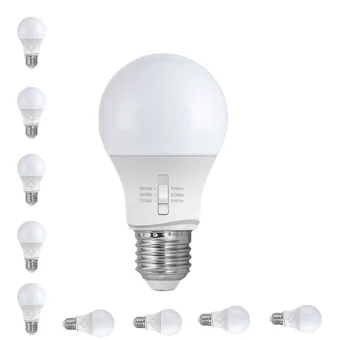 E27EST CNF 8.5W es un pack de 10 bombillas , con casquillo de rosca estándar E27 CCT, que permite ajustar la temperatura de color de la luz (cálida, neutra o fría) para adaptarse a diferentes ambientes y necesidades.