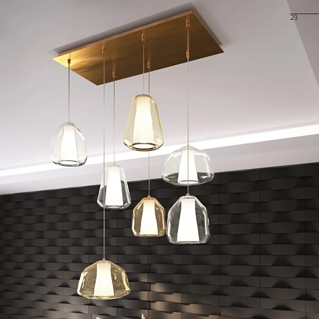 La suspensión Double Skin está compuesta por n. 7 downlights equipados con portalámparas E27 para bombillas LED.
