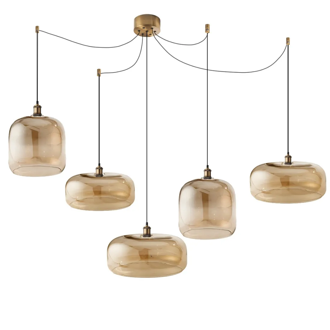 Una lámpara colgante clásica con acabado en cristal ámbar que ilumina y decora a la vez. Una lámpara de techo de cinco luces que, gracias a su descentralización, permite ajustar la distancia entre los puntos de luz y su altura por separado. Una luminaria ideal para iluminar superficies como mesas de comedor o crear un efecto de telaraña en el centro del techo para un efecto más ornamental.