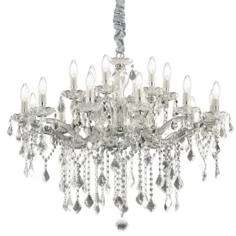 Estructura de metal con elementos decorativos de cristal. Colgantes con elementos octogonales y gotas finales en cristal tallado. Disponible en la versión con cristal transparente y metal cromado.