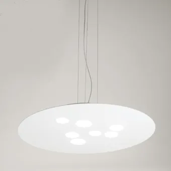 Suspensión moderna que decora con forma y luz. Una araña con doble emisión de luz que realza las superficies lisas de la estancia y la realza en toda su sencillez. Una luminaria también apta para iluminar techos con vigas, madera o frescos.