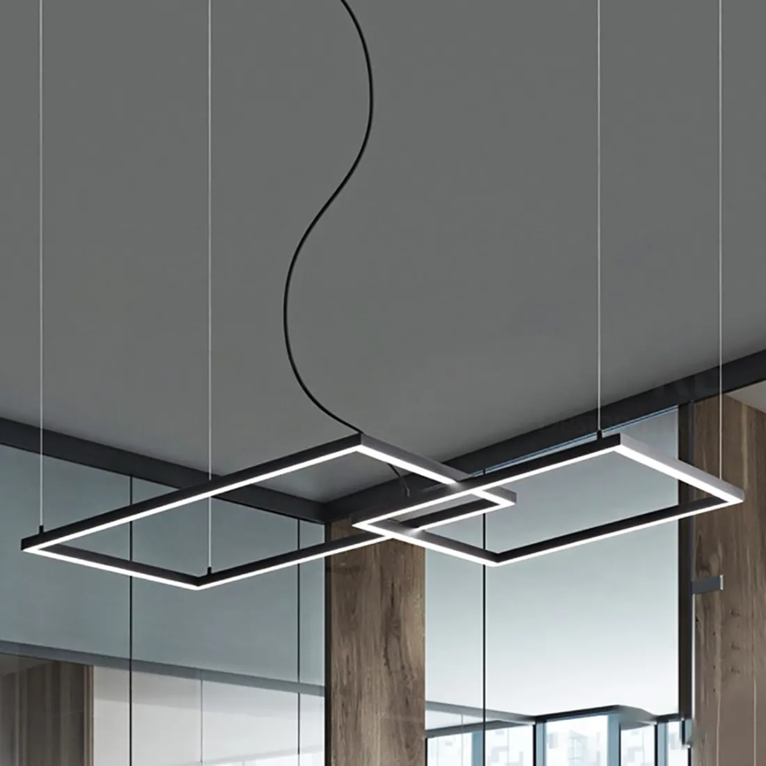 La araña está formada por DOS cuadrados de aluminio pintado en polvo negro mate con difusor acrílico satinado, cables regulables en longitud. Mide una longitud de 96 cm, una proyección de 48 cm y una altura máxima de 150 cm ajustable.