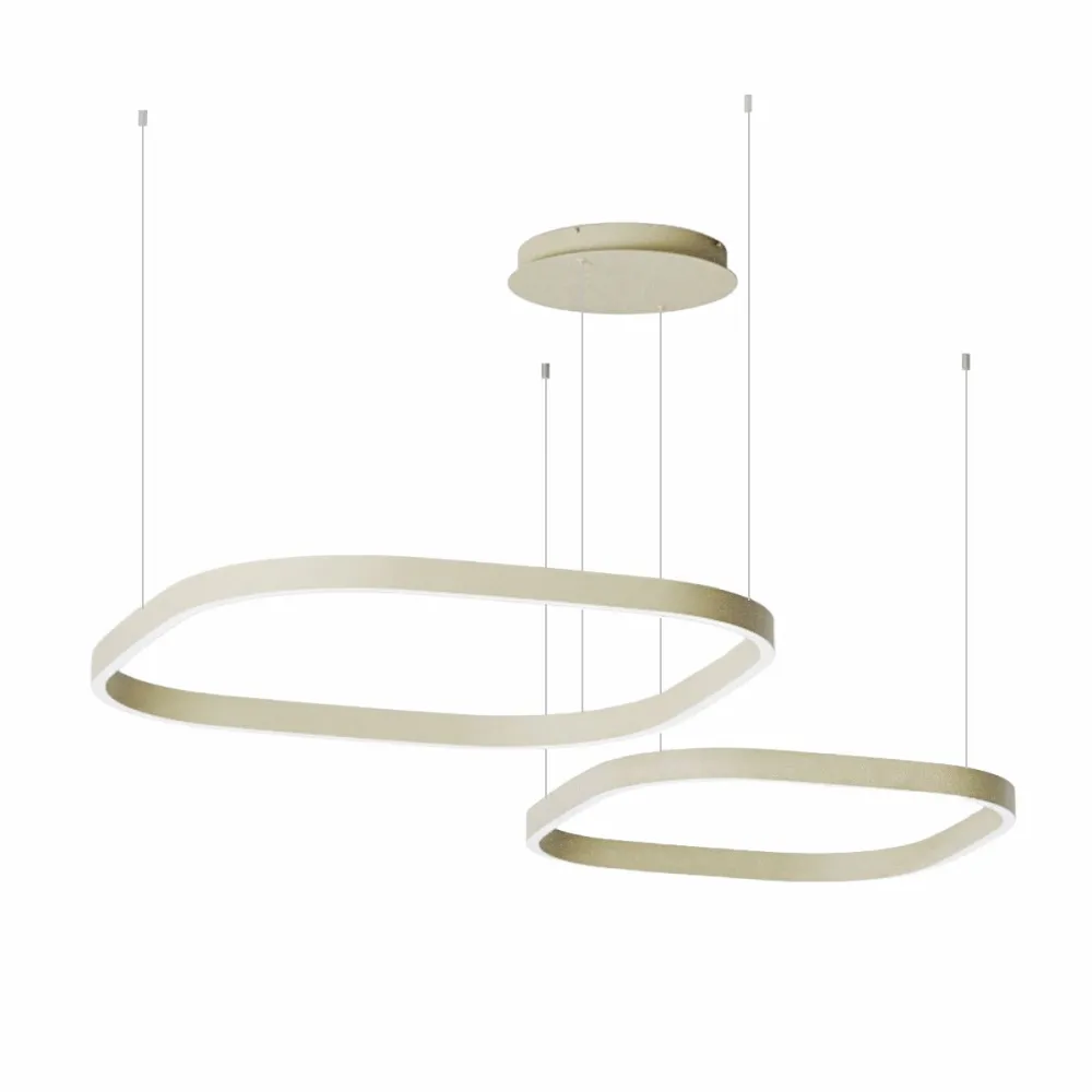 Una geometría sutil que combina rigor y delicadeza, donde la luz se abre suavemente, envuelta en contornos fluidos. CRISEIDE S2D QUADRATA FCRSV5Q es una moderna lámpara de araña de doble anillo, una solución de iluminación elegante y eficiente para interiores contemporáneos. Fabricada en aluminio, destaca por sus dos difusores geométricos de silicona blanca opalina que proporcionan una luz difusa y uniforme de 360°. El efecto visual suspendido, logrado gracias a los cables ajustables de hasta 300 cm, crea una atmósfera sofisticada y luminosa, ideal para salas de estar, salas de reuniones, etc.