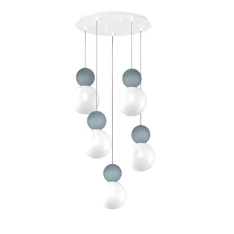 COTTAGE 1228/S5 T es una lámpara colgante de diseño contemporáneo y refinado, diseñada para aportar luz y estilo a espacios modernos. Su impactante composición incluye cinco luces con esferas que cuelgan de una base redonda de metal blanco de 40 cm de diámetro, creando un efecto visual de estética impactante.