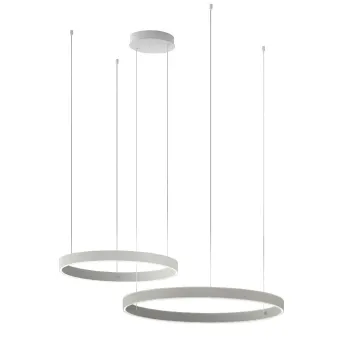 La lámpara colgante GAME BIS S80+S100 es un modelo contemporáneo compuesto por dos elegantes círculos luminosos de 80 cm y 100 cm de diámetro, que crean un efecto dramático y sofisticado. Con una sólida base de techo y tres reguladores de intensidad, esta lámpara ofrece iluminación bidireccional gracias a sus difusores de silicona opalina blanca que proyectan la luz tanto hacia arriba como hacia abajo. Esta configuración no solo garantiza una iluminación uniforme y envolvente de la superficie inferior, sino que también utiliza el techo como reflector natural, ampliando la percepción del espacio y creando una atmósfera de gran belleza estética.