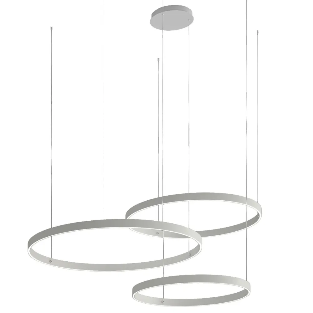 La lámpara colgante GAME TRIS S40+S60+S80 cuenta con tres círculos luminosos de 40 cm, 60 cm y 80 cm de diámetro, que emiten luz tanto hacia arriba como hacia abajo. Se apoya sobre una base de techo y cuenta con controles ajustables. Incorpora un módulo LED CCT que permite seleccionar el color de luz deseado entre 3000 K y 4000 K antes de la instalación. Su altura es regulable y está disponible en 16 elegantes acabados.