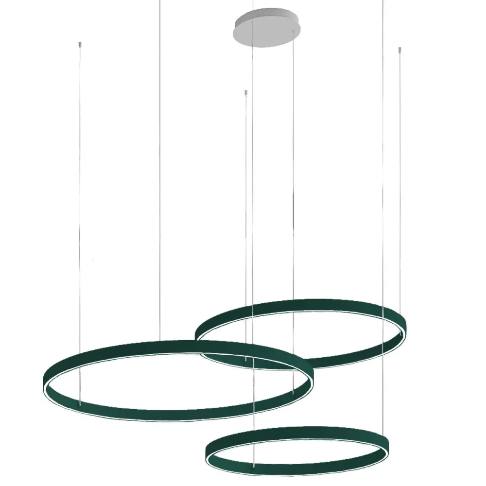 La lámpara colgante GAME TRIS S40+S60+S80 es una pieza sofisticada que combina diseño moderno y funcionalidad avanzada. Está compuesta por tres círculos luminosos de 40 cm, 60 cm y 80 cm de diámetro. Su elegante y versátil estructura destaca por su emisión de luz hacia arriba y hacia abajo, creando una iluminación cautivadora y espectacular. Gracias a su robusta base de techo y su altura regulable, esta lámpara permite personalizar la altura hasta un máximo de 300 cm, adaptándose perfectamente a cualquier espacio.