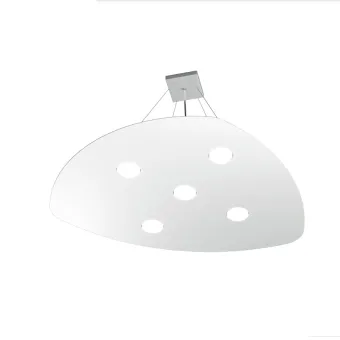 Suspensión realizada con una placa de metal de forma suave e irregular pintada en diferentes acabados (gris, arena o blanco). El punto fuerte del producto consiste en no utilizar LED integrados sino bombillas Gx53 que, una vez montadas, quedan enrasadas con la placa metálica y se pueden sustituir fácilmente desde el exterior.