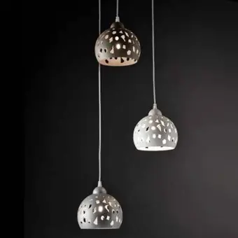 Suspensión de tres luces, moderna, con particulares difusores de metal con hechura perforada y de los que salen bonitos rayos de luz. Una suspensión realmente original para colocar sobre la mesa, escritorio, penínsulas... o incluso en el centro de la estancia.