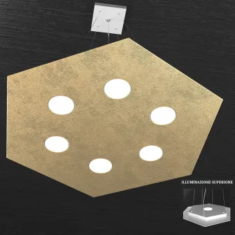 Colección de lámparas hexagonales formadas por placas de metal pintadas en diferentes acabados, BLANCO, GRIS, ARENA, MARRÓN, GRIS ANTRACITA, HOJA DE PLATA, HOJA DE ORO o HOJA DE COBRE. La araña está equipada con cables de acero y cable eléctrico ajustable en altura. La suspensión monta seis portalámparas en la parte inferior y uno en la parte superior con portalámparas GX53 para bombillas LED max 9W excluidas. Es posible variar la intensidad de la luz gracias a las bombillas especiales regulables que se pueden elegir por separado.