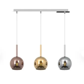 FUTURE 1155CR/S3 RP MC compuesto por una base rectangular de metal cromado pulido y tres difusores de vidrio en forma de ampolla, muy particular gracias a la extensión del vástago de vidrio Pyrex. La composición se compone de tres vasos de 15 centímetros de diámetro en los colores cromo, cobre y oro. Ideal para iluminar una mesa de comedor o una península de cocina, etc... Una suspensión que se puede regular en altura y crear un juego escalonado de pequeñas gotas que dan movimiento al ambiente. Una lámpara de araña para instalar en cualquier superficie o en el centro de la habitación.