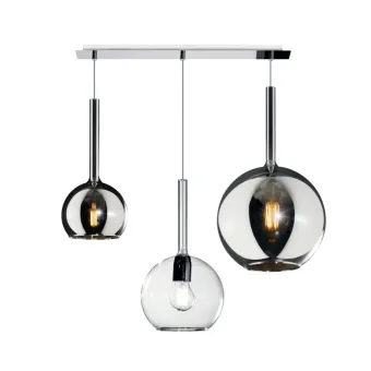 Lámparas de suspensión formadas por tres ampollas de vidrio Pyrex soplado de diferentes diámetros 15 - 20 - 25 centímetros, regulables en altura. La base rectangular mide 60 centímetros de largo y 4 centímetros de ancho.
