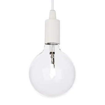 Florón y cuerpo de luz en metal acabado en pintura blanca o negra mate. Cable eléctrico revestido en tela. La suspensión monta un portalámparas halógeno de 60W, bajo consumo o LED casquillo E27. Bombilla LED 8W 3000°K INCLUIDA.